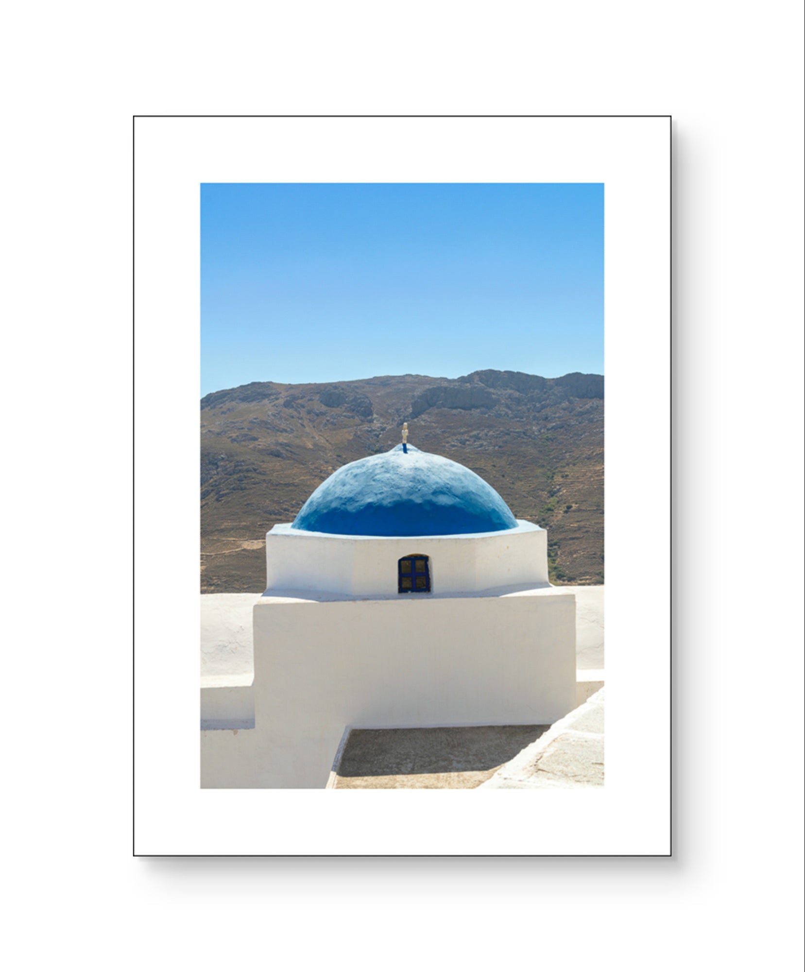 “Dome” brings the charm of the Greek island to your home. The enchanting church dome, carved in the Cycladic white, exudes the simplicity and elegance of traditional architecture. The composition of the photographic frame is enhanced by the vivid blue of the Aegean sky, offering an unparalleled sense of tranquility and freedom. A true artistic experience, offering a journey into Aegean magic.